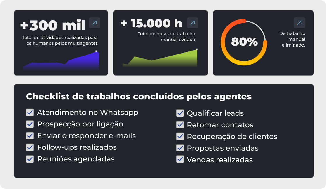 A previsão é clara: até 2030, 30% das atividades serão automatizadas por inteligência artificial. Isso inclui prospecção, follow-ups, atendimento e grande parte do contato com clientes. Com a MultiAgents, você não precisa esperar o futuro — já pode contar com agentes de IA que operam 24/7, otimizam os trabalhos do seu time e geram resultado em escala, com mais eficiência e menor custo.